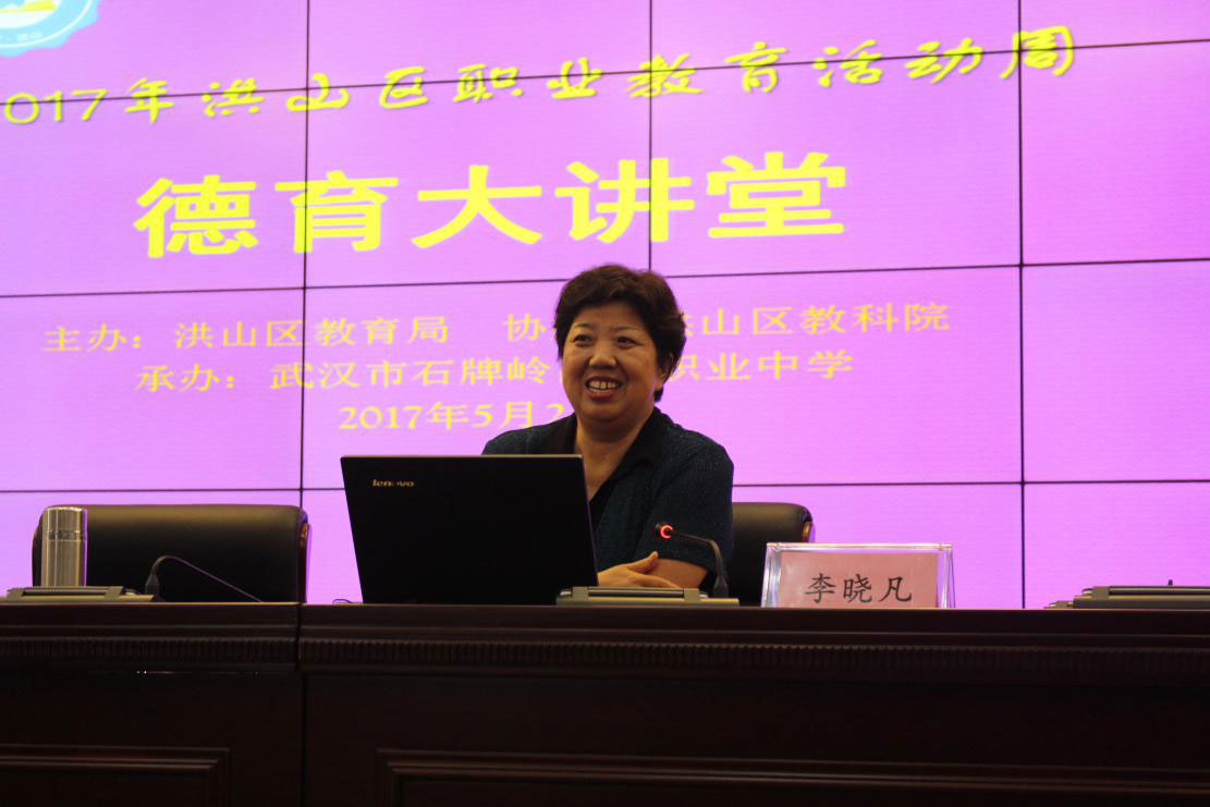 5月2日下午两点,由洪山区教育局主办、洪山区教育科学研究院协办、石牌岭高级职业中学和武汉华大教师教育发展研究院承办的洪山区职业教育活动周系列活动之“德育大讲堂”活动在武汉市石牌岭高级职业中学报告厅顺利举办。出席此次活动的领导和教师有洪山区教育局副局长高作旭、洪山区教育局职成科科长肖四堂、洪山区教育局职成科副科长熊稚玲、洪山区教科院副院长陈爱忠、洪山区社区教育学院院长陈为庆、洪山区教科院职教教研员高旭琳,以及区属各中职学校领导、政教主任、团委书记和班主任。另外,来自区属各中职学校学生家长代表和社区居民代表近两百余人也参加了此次活动。此次活动由洪山区教育局职成科科长肖四堂主持。